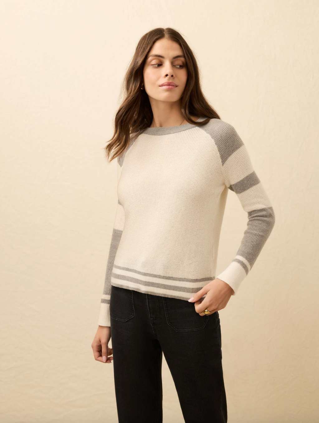 Channel your inner varsity spirit in this elevated throwback crew. Crafted from the dreamiest blend of organic cotton and cashmere, it's got all the nostalgic charm of classic collegiate sportswear with serious comfort upgrades. The textured waffle stitch and relaxed fit make it your new go-to for cozy days—whether you're lounging or layering. Finished with ribbed trim at the cuffs, hem, and neckline for that polished touch. At 23" in length with a classic fit, it's the perfect balance of effortless and refined.