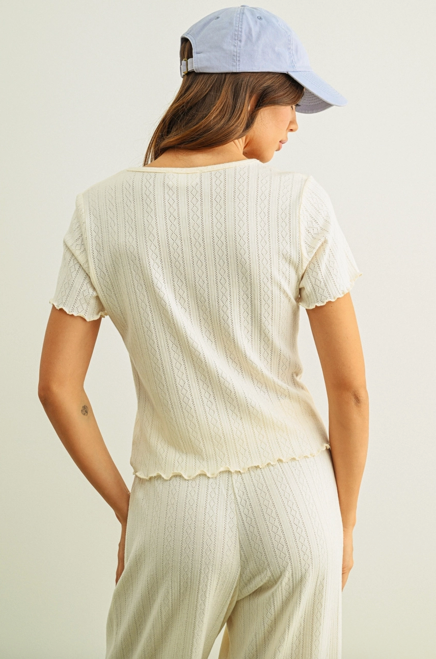 The Liv Top features a delicate pointelle knit construction that delivers breathable comfort with subtle textural interest. This short sleeve style offers versatile layering potential—wear it solo for warm weather or beneath structured pieces for added dimension. The refined pointelle pattern creates an understated elegance that transitions seamlessly from casual to polished occasions. Perfect for building a wardrobe of essentials that work harder through thoughtful design.