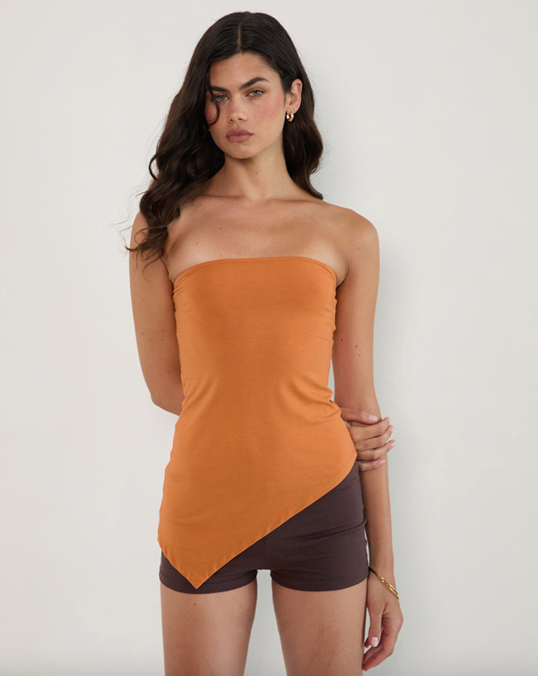 Turn heads in the Motel Rocks Arimbi Bandeau Top in vibrant sunset orange. Its playful bandeau silhouette pairs perfectly with an asymmetric handkerchief hemline, adding a fun and flirty twist to your look. Ideal for sunny days and festive nights, this top brings a pop of color and effortless style to your wardrobe.